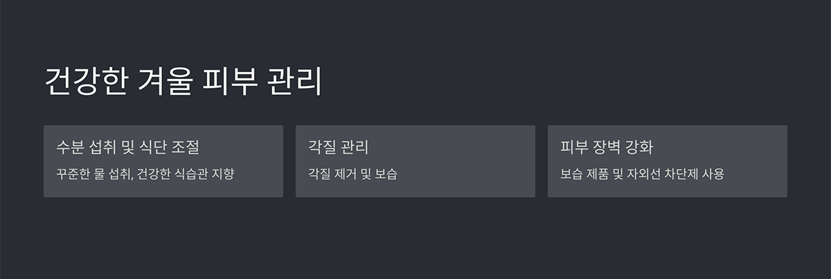 겨울철 피부는 환경적 요인으로 인해 장벽 기능이 약화되기 쉽습니다. 피부 장벽이 무너지면 수분이 쉽게 증발하고 외부 자극에 더욱 취약해집니다.