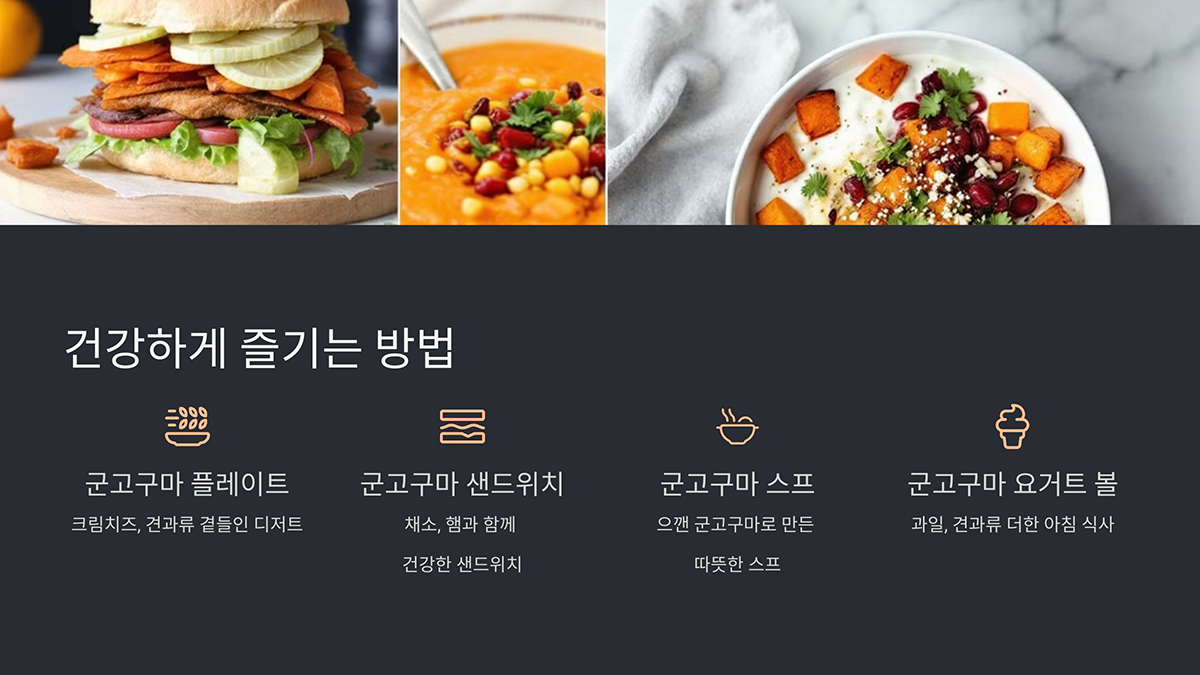 - 군고구마 플레이트: 슬라이스 한 군고구마에 크림치즈나 견과류를 올려 고급스러운 디저트로 변신시켜 보세요.