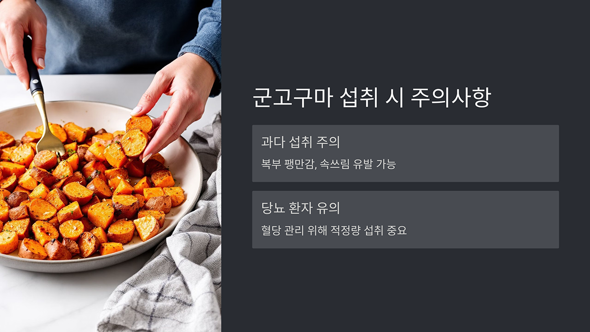 - 과다 섭취 주의: 군고구마는 섬유질과 당분이 풍부하여 과도하게 섭취하면 복부 팽만감이나 속 쓰림을 유발할 수 있습니다.