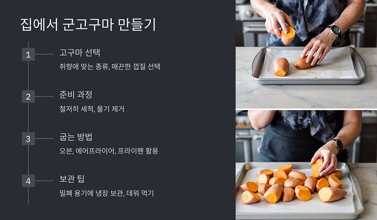 - 프라이팬 사용: 약불에서 뚜껑을 닫고 천천히 구우면 촉촉하면서도 고소한 군고구마를 만들 수 있습니다.