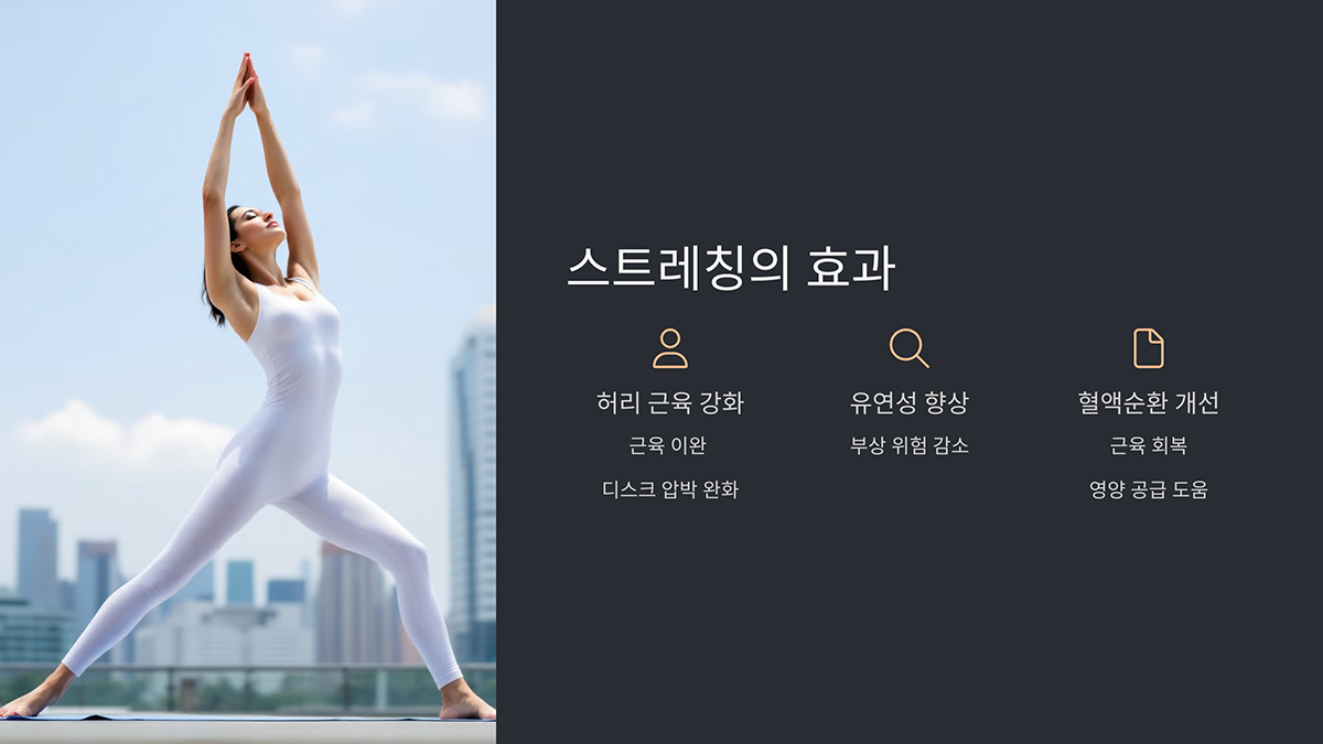 스트레칭은 허리와 척추 주변의 유연성을 높여 부상 위험을 줄입니다. 유연한 허리는 갑작스러운 움직임에도 쉽게 손상되지 않습니다.